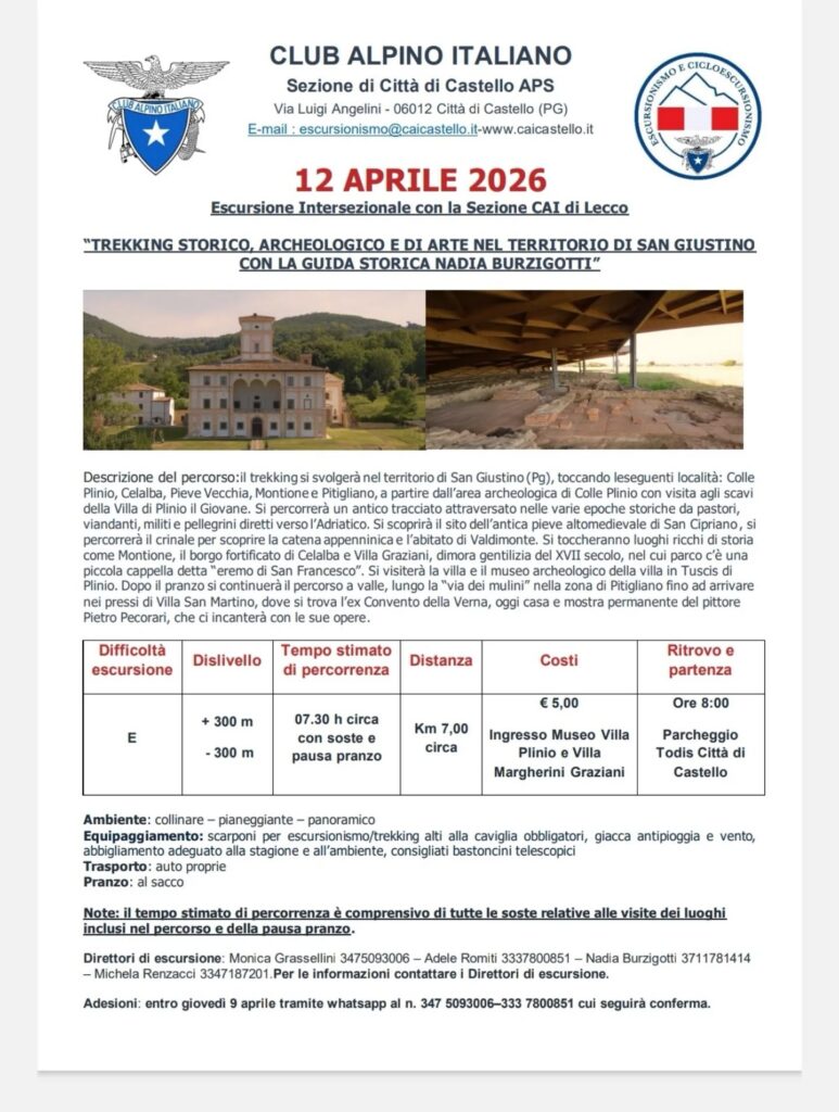 Domenica 12 aprile sarà invece la volta del “Trekking storico, archeologico e artistico nel territorio di San Giustino”, guidato dalla storica Nadia Burzigotti, che accompagnerà i partecipanti alla scoperta delle radici culturali del territorio di San Giustino.