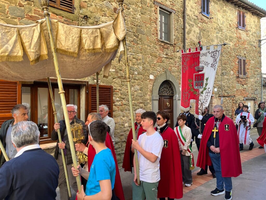 Il borgo si è vestito a festa con drappi porporini e dorati alle finestre, mentre il suono delle campane ha richiamato numerosi preggesi, residenti e non, tornati per partecipare a uno dei momenti più sentiti della comunità.