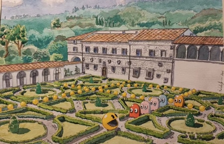 Realizzata in acquerello e inchiostro (42×30 cm), l’opera nasce da un’intuizione suggestiva: le geometrie dei giardini di Palazzo Vitelli, che ricordano un labirinto, diventano lo scenario perfetto per reinterpretare in chiave artistica il celebre videogioco Pac-Man.