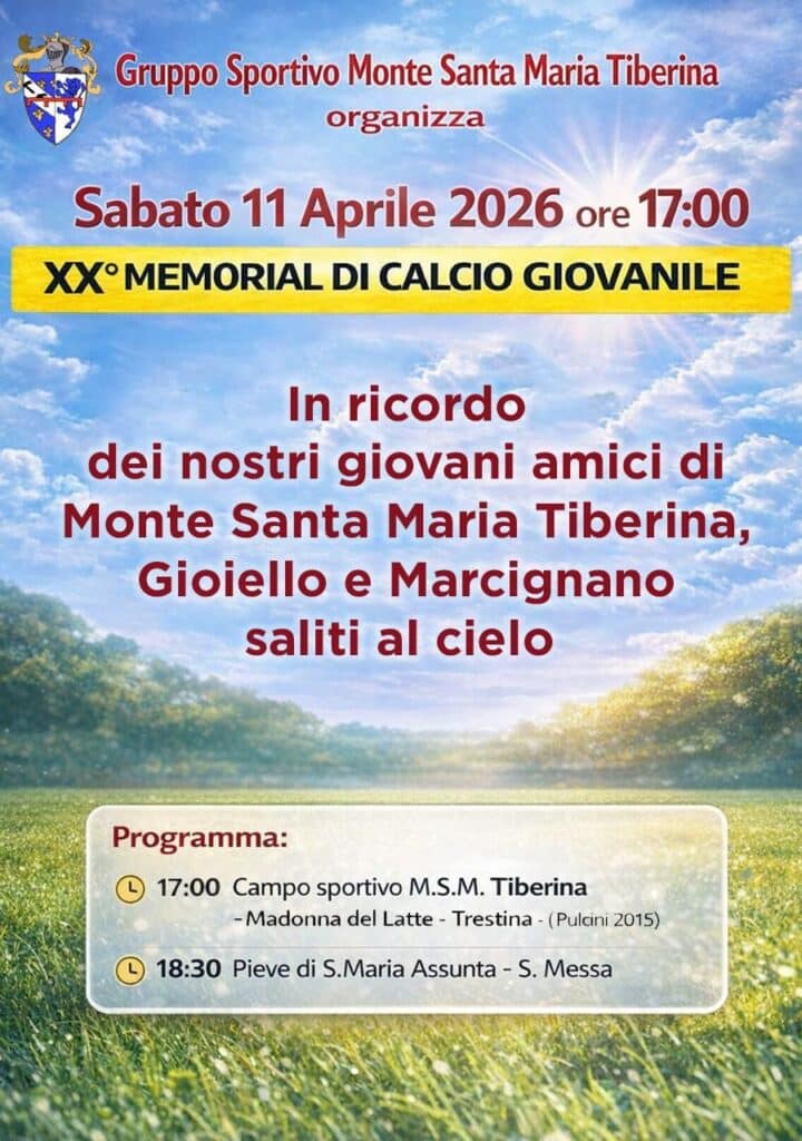 Una giornata di sport e memoria a Monte Santa Maria Tiberina, dove sabato 11 aprile 2026 si terrà il XX Memorial di calcio giovanile organizzato dal Gruppo Sportivo Monte Santa Maria Tiberina.