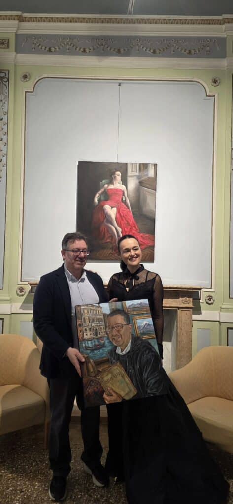 Durante l’ evento ’artista ha omaggiato il cultural manager di Palazzo Pisani Revedin, Samuel Sarkis Baghdassarian, con un ritratto, riconoscendone il ruolo di promotore dell’arte in Laguna.