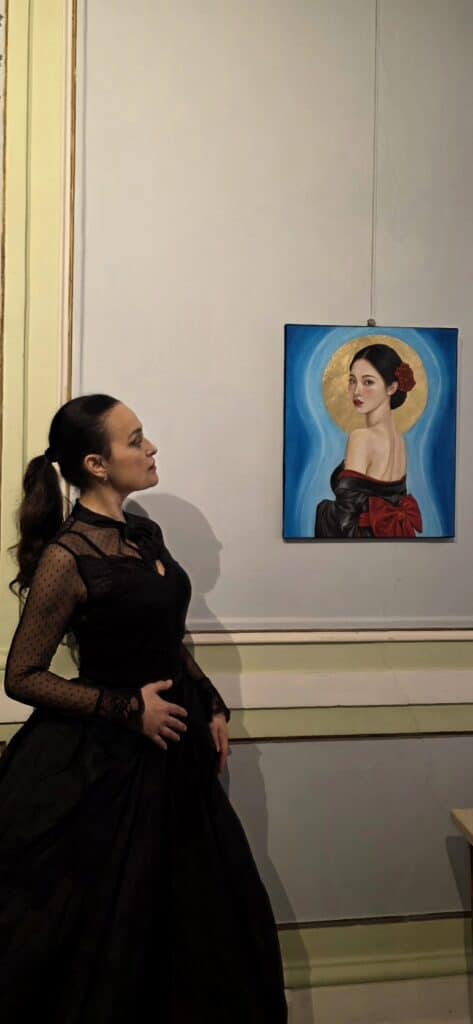 Parallelamente all’omaggio francese, l’artista umbra ha inaugurato nella suggestiva Sala degli Stucchi la sua mostra personale “Pas seulement des portraits…”. Il percorso espositivo esplora i temi dell’identità e della femminilità attraverso ritratti inediti di donne orientali, autoritratti e l’opera iconica “Il peccato più prelibato”.