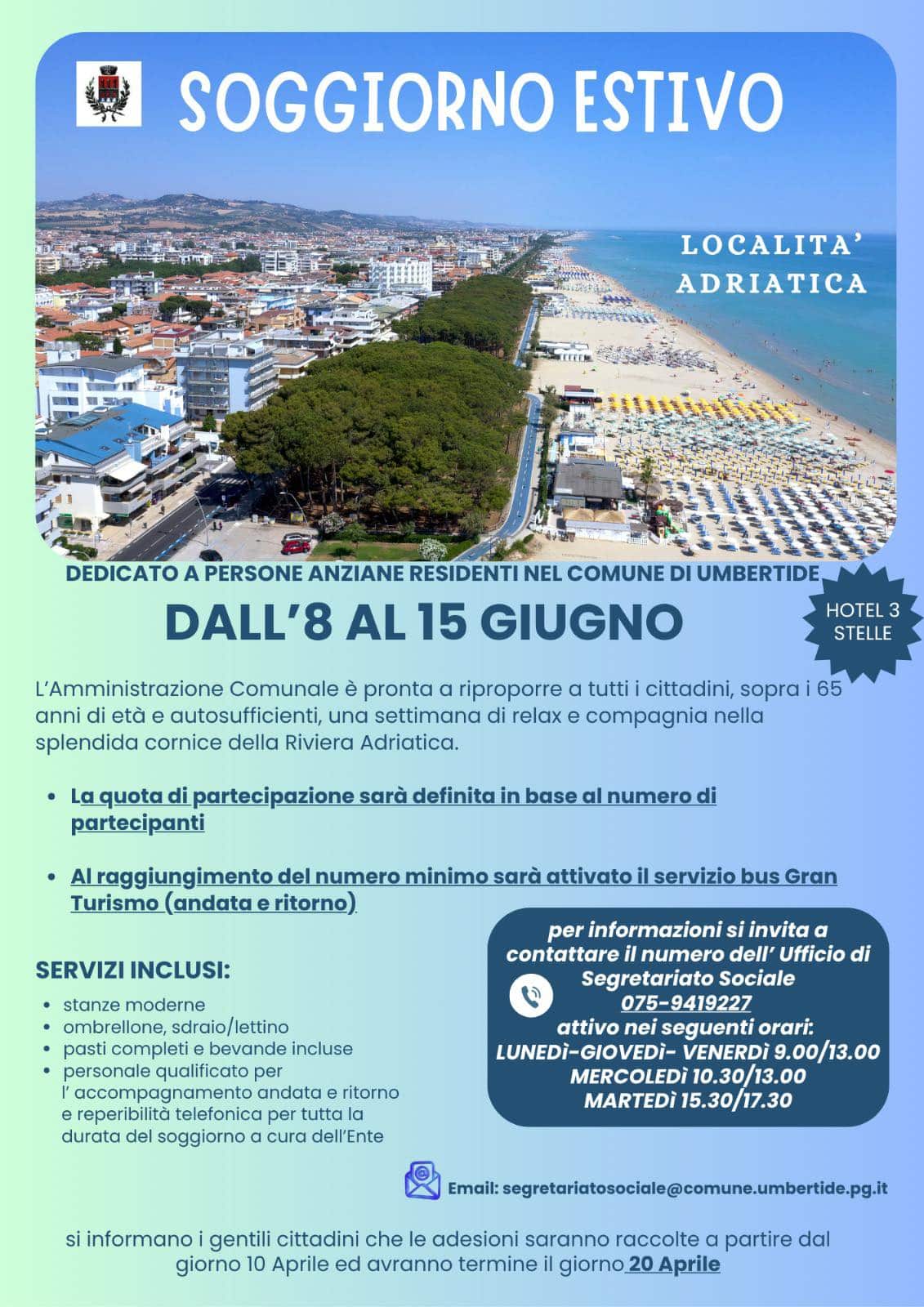 Dallโ€™8 al 15 giugno, nella splendida cornice della Riviera Adriatica, sarร  possibile vivere un soggiorno estivo in hotel 3 stelle, riservato a persone anziane residenti nel Comune di Umbertide, autosufficienti, allโ€™insegna del relax e della compagnia.