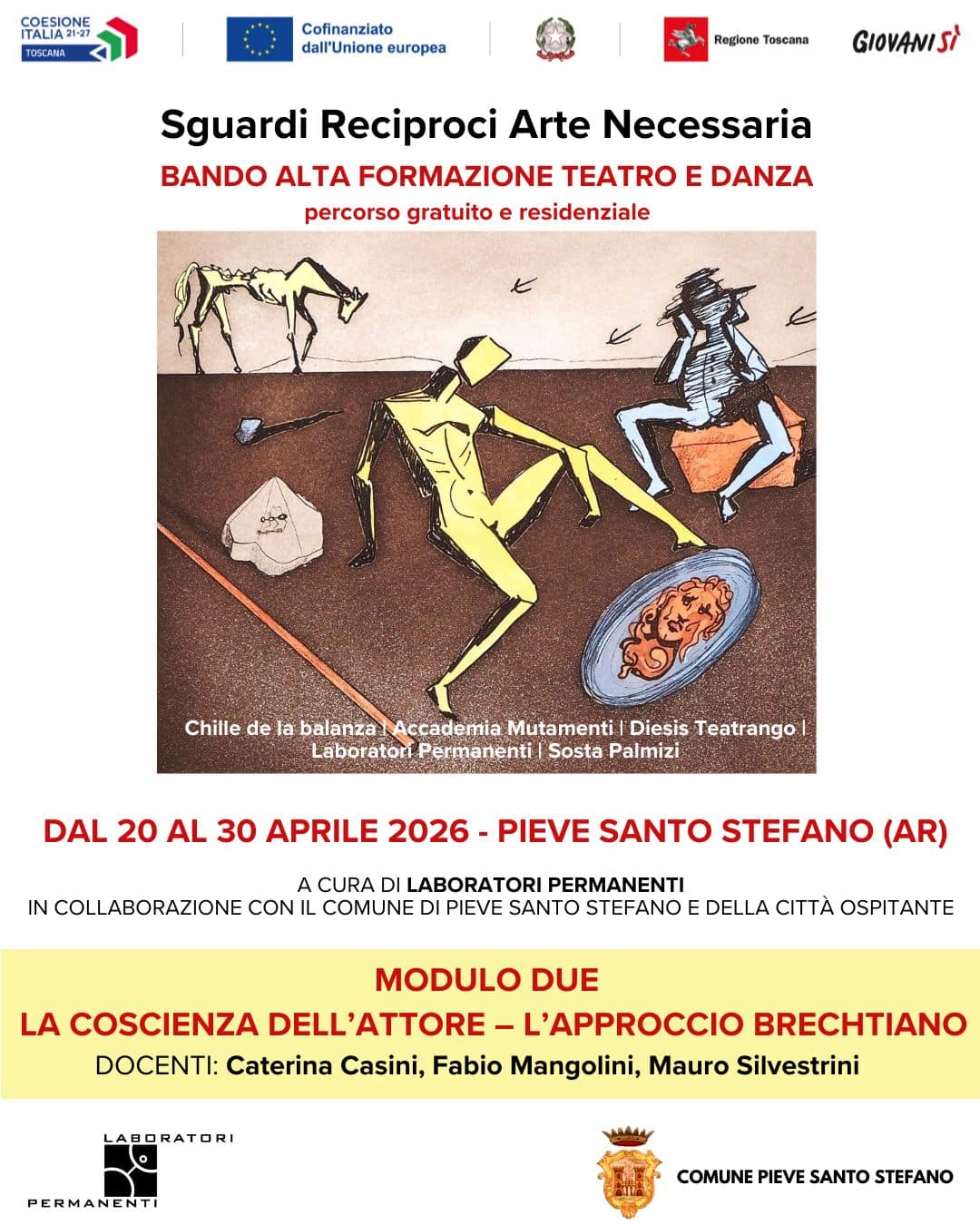 Il secondo modulo di questo percorso residenziale avrà luogo dal 20 al 30 aprile al Teatro Comunale G. Papini di Pieve Santo Stefano, a cura di Laboratori Permanenti con il focus su La coscienza dell’attore – l’approccio brechtiano con i docenti: Caterina Casini, Fabio Mangolini e Mauro Silvestrini.