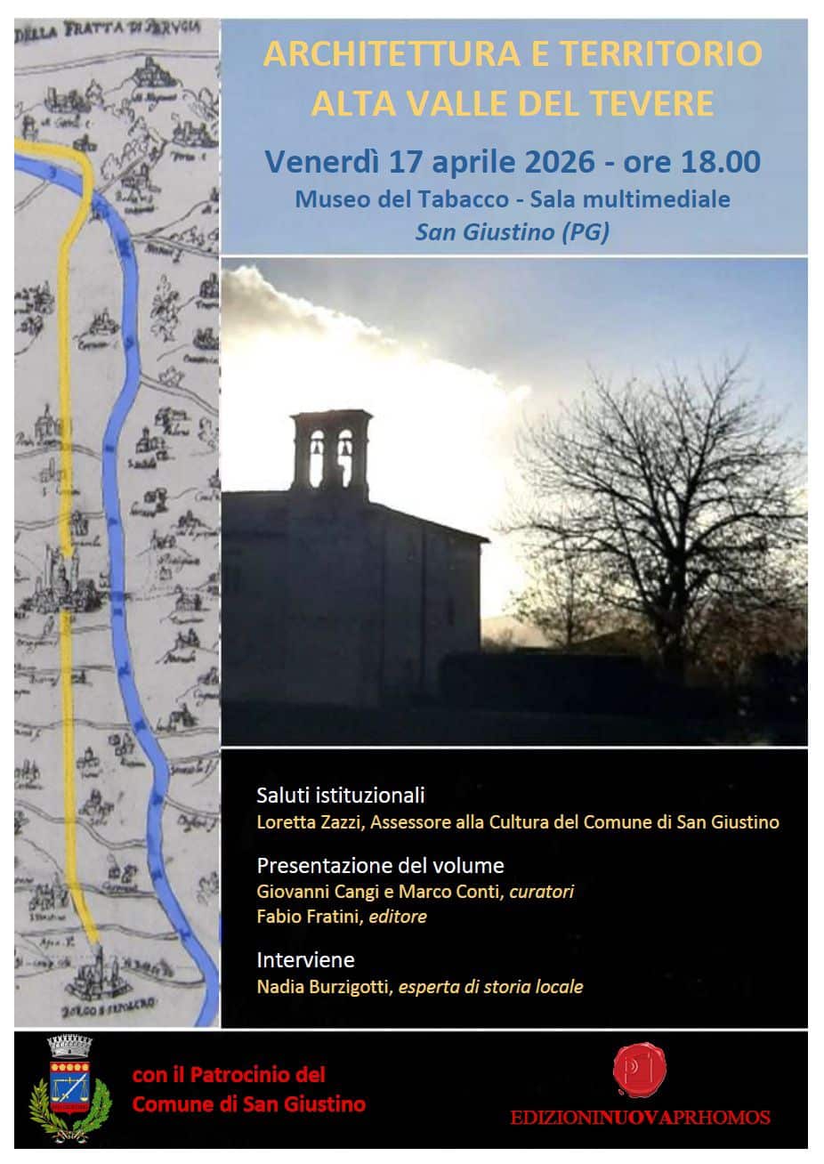 Un viaggio tra storia, paesaggio e identità dell’Alta Valle del Tevere: venerdì 17 maggio alle ore 18.00, nella Sala del Museo del Tabacco di San Giustino, sarà presentato il volume “Architettura e territorio dell’Alta Valle del Tevere” di Giovanni Cangi e Marco Conti, edito da Nuova Prhomos.