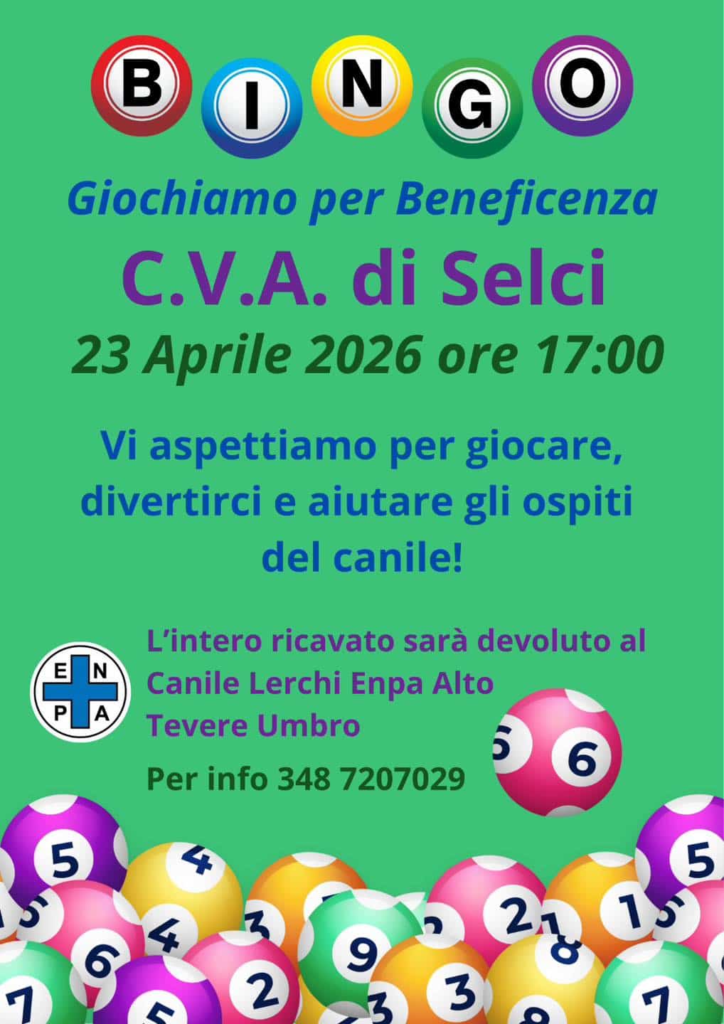 Un pomeriggio all’insegna del divertimento e della solidarietà: giovedì 23 aprile alle ore 17 il CVA di Selci ospiterà un bingo benefico a sostegno del Canile di Lerchi ENPA Alto Tevere Umbro.