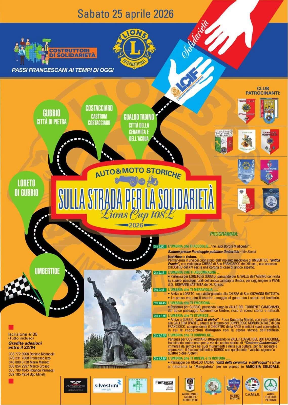Il Lions Club Città di Castello Tiferno organizza per sabato 25 aprile 2026 l’evento “Sulla strada per la solidarietà – Passi francescani ai tempi di oggi”, una giornata speciale tra motori, paesaggi e valori condivisi.