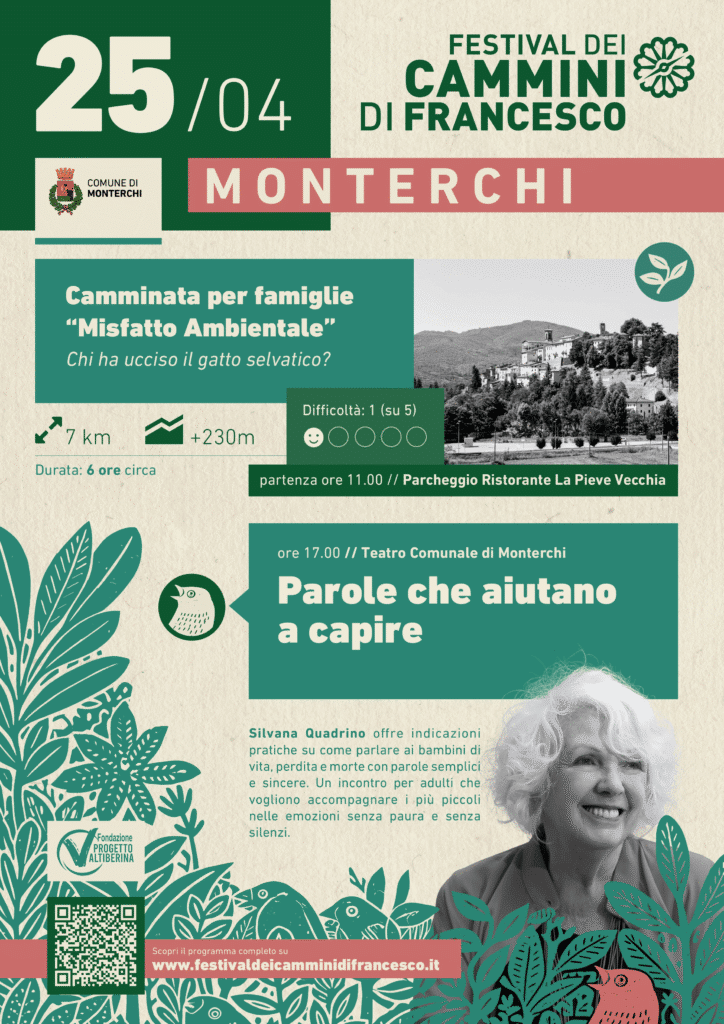 Nel pomeriggio, alle ore 17.00 al Teatro Comunale di Monterchi, è in programma l’incontro “Parole che aiutano a capire” con Silvana Quadrino, pedagogista e psicoterapeuta della famiglia. Un momento di confronto dedicato agli adulti, per riflettere su come accompagnare bambini e ragazzi nell’affrontare temi complessi come la vita, la perdita e la morte, con strumenti semplici e consapevoli.