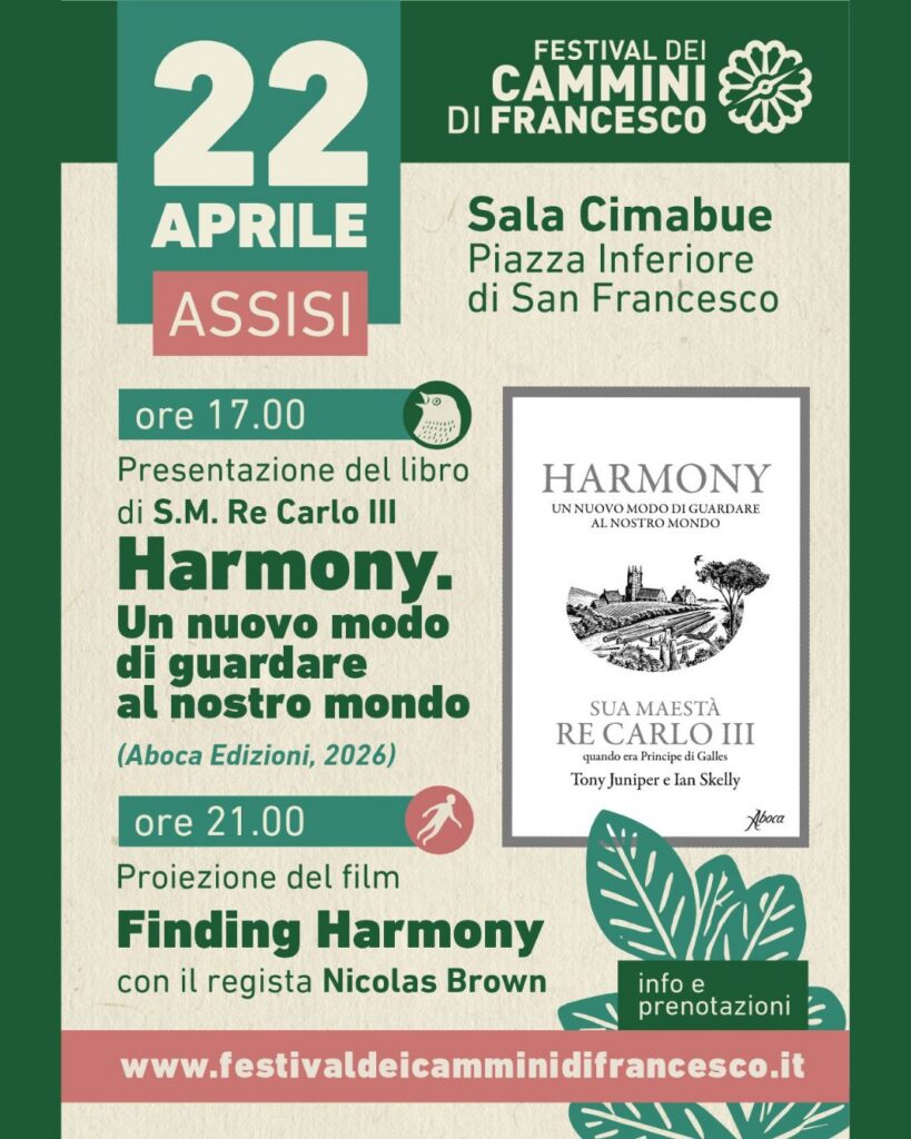 Il programma prenderà il via alle ore 8.30 con la camminata verso l’Eremo delle Carceri, sul Monte Subasio, organizzata in collaborazione con il Circolo degli Esploratori, per poi proseguire nel pomeriggio con la presentazione dell’edizione italiana del libro di Sua Maestà Re Carlo III, Harmony. Un nuovo modo di guardare al nostro mondo, edito da Aboca Edizioni, alla presenza dei coautori Ian Skelly e Tony Juniper e di rappresentanti del mondo scientifico, istituzionale e religioso.