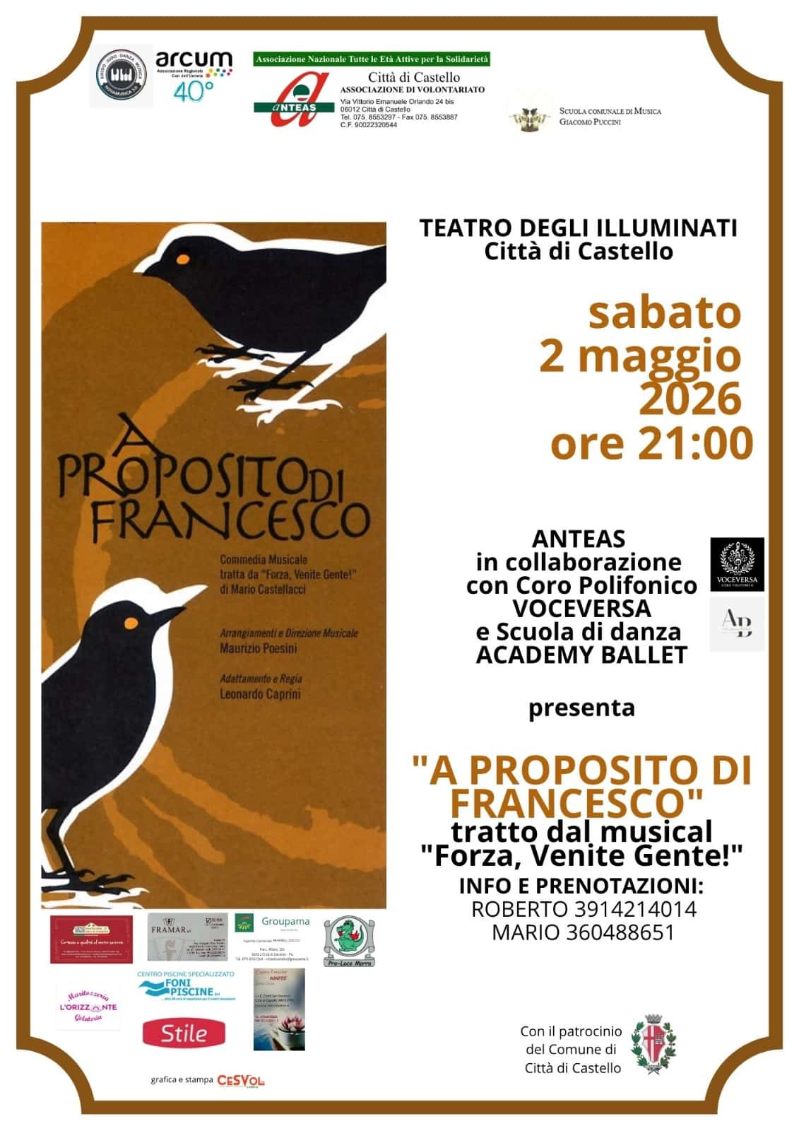 CITTÀ DI CASTELLO – Una serata di teatro, musica e solidarietà al Teatro degli Illuminati. Sabato 2 maggio alle ore 21 andrà in scena “A proposito di Francesco”, spettacolo ispirato alla celebre commedia musicale Forza, Venite Gente! di Mario Castellacci.