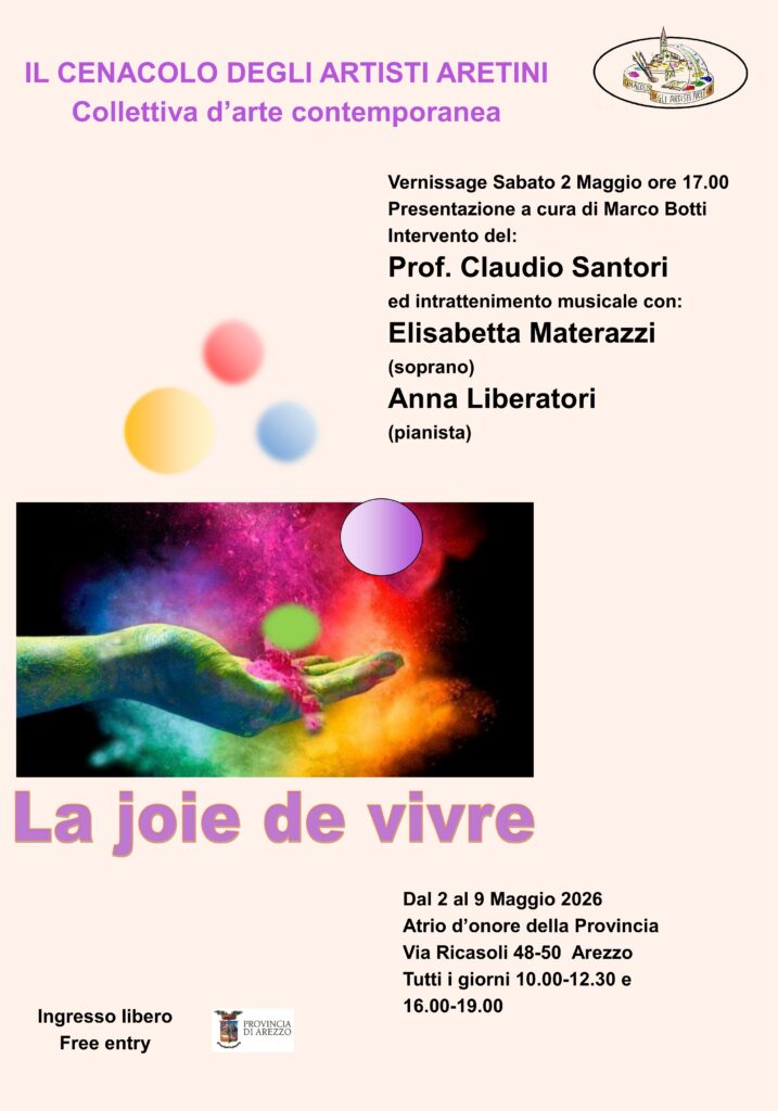 AREZZO – Dal 2 al 9 maggio 2026 l’Atrio d’Onore della Provincia di Arezzo di via Ricasoli 48/50, ad Arezzo, ospita “La joie de vivre”, collettiva del Cenacolo degli Artisti Aretini.