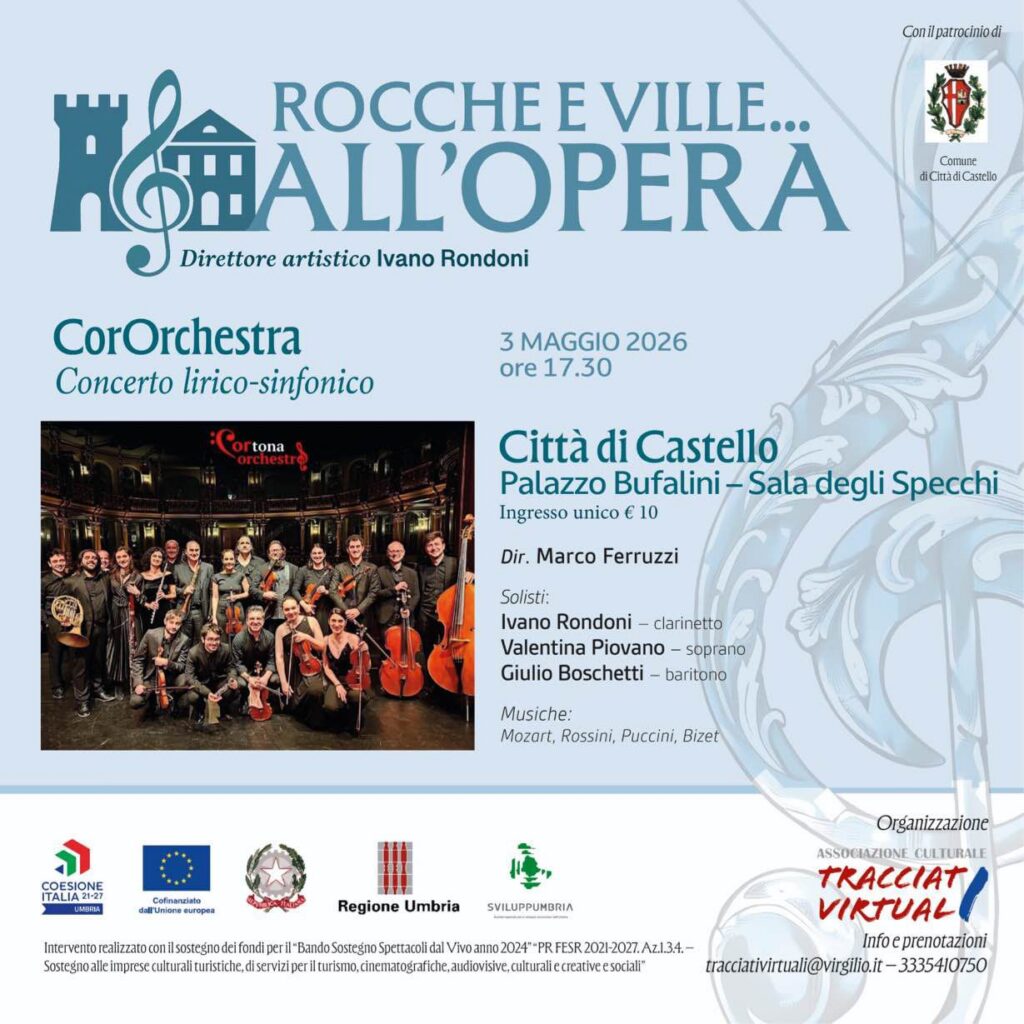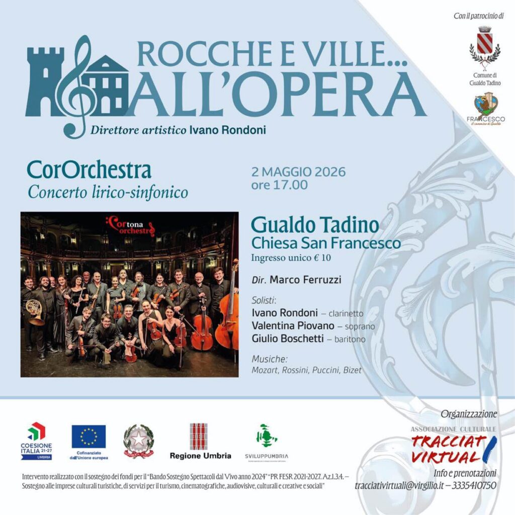 Il giorno successivo, venerdì 2 maggio, la rassegna farà tappa a Gualdo Tadino, nella Chiesa di San Francesco, con la CorOrchestra Cortona diretta da Marco Ferruzzi. Sul palco anche i solisti Ivano Rondoni al clarinetto, Valentina Piovano (soprano) e Giulio Boschetti (baritono), per un programma che attraversa alcune delle più celebri pagine del repertorio operistico, da Le Nozze di Figaro a La Bohème, fino a Carmen e Il Barbiere di Siviglia.