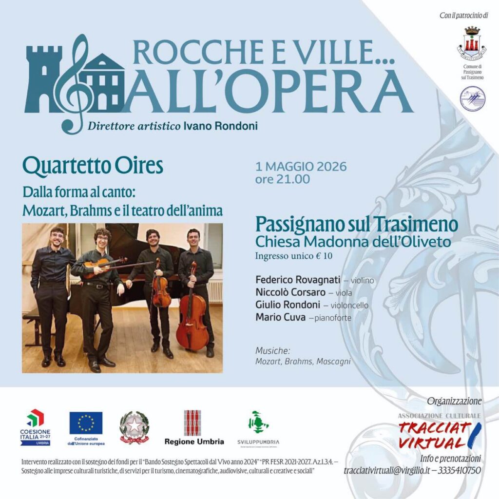 Il tour riparte giovedì 1 maggio a Passignano sul Trasimeno con il concerto “Mozart, Brahms e il Teatro dell’Anima”, ospitato nella suggestiva Chiesa dell’Oliveto. Protagonista sarà il Quartetto OIRES, che proporrà un viaggio musicale tra classicismo e romanticismo con musiche di Wolfgang Amadeus Mozart, Johannes Brahms e Pietro Mascagni.