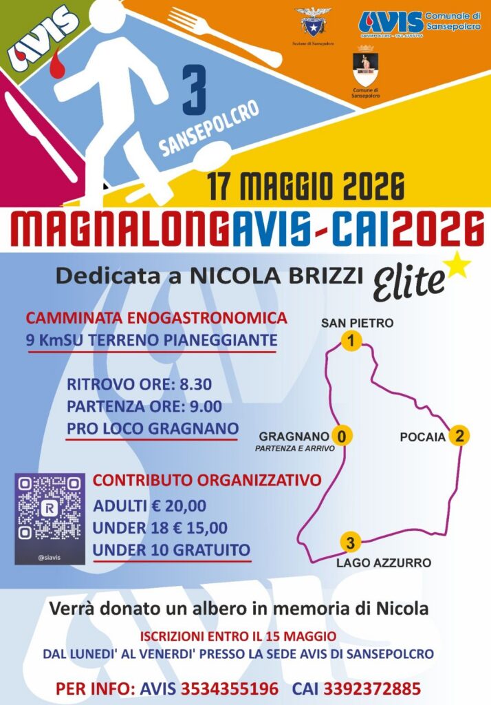 SANSEPOLCRO – Domenica 17 maggio 2026 torna uno degli appuntamenti più attesi della primavera: la Magnalonga AVIS-CAI, camminata enogastronomica di circa 9 km su terreno pianeggiante, dedicata alla memoria di Nicola Brizzi.