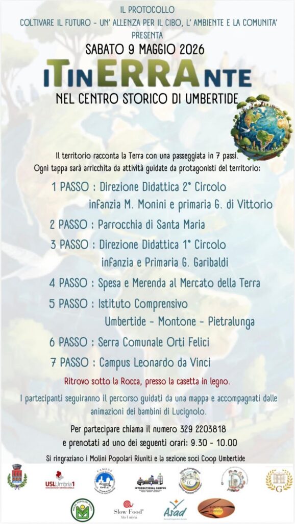 Il percorso sarà animato da laboratori, attività educative ed esposizioni, realizzati dalle scuole del territorio insieme a numerose realtà locali, tra cui l’Istituto Comprensivo Umbertide–Montone–Pietralunga, il Campus Leonardo da Vinci, la Parrocchia di Santa Maria, la cooperativa ASAD e il Mercato della Terra con Slow Food Alta Umbria.